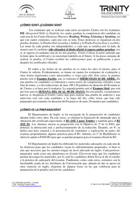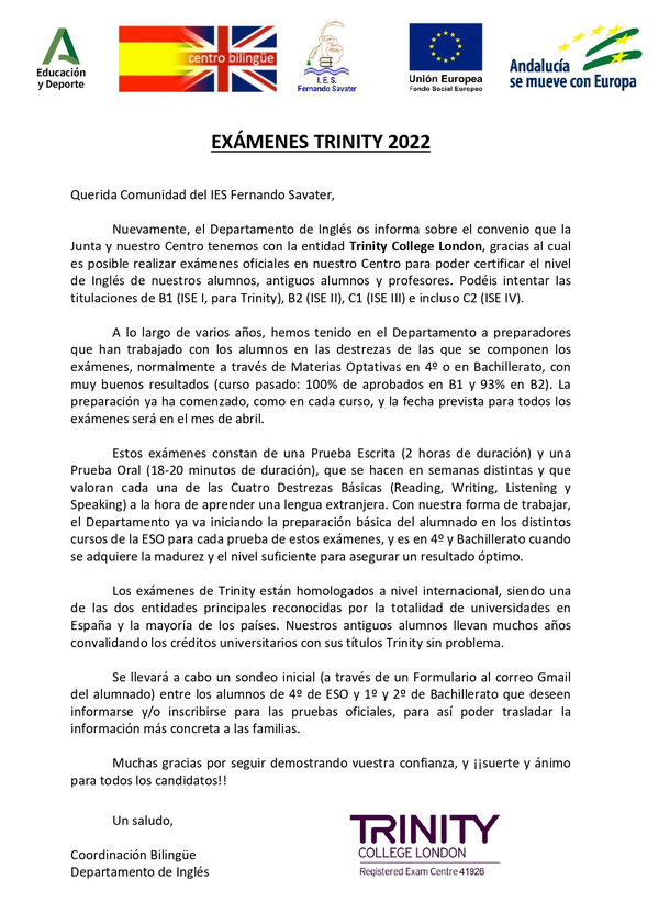 From the Department of English we are pleased to invite you to know our preparing programme for official exams of Trinity College London, aimed at students, alumni and teachers of our school to certify their level of English.