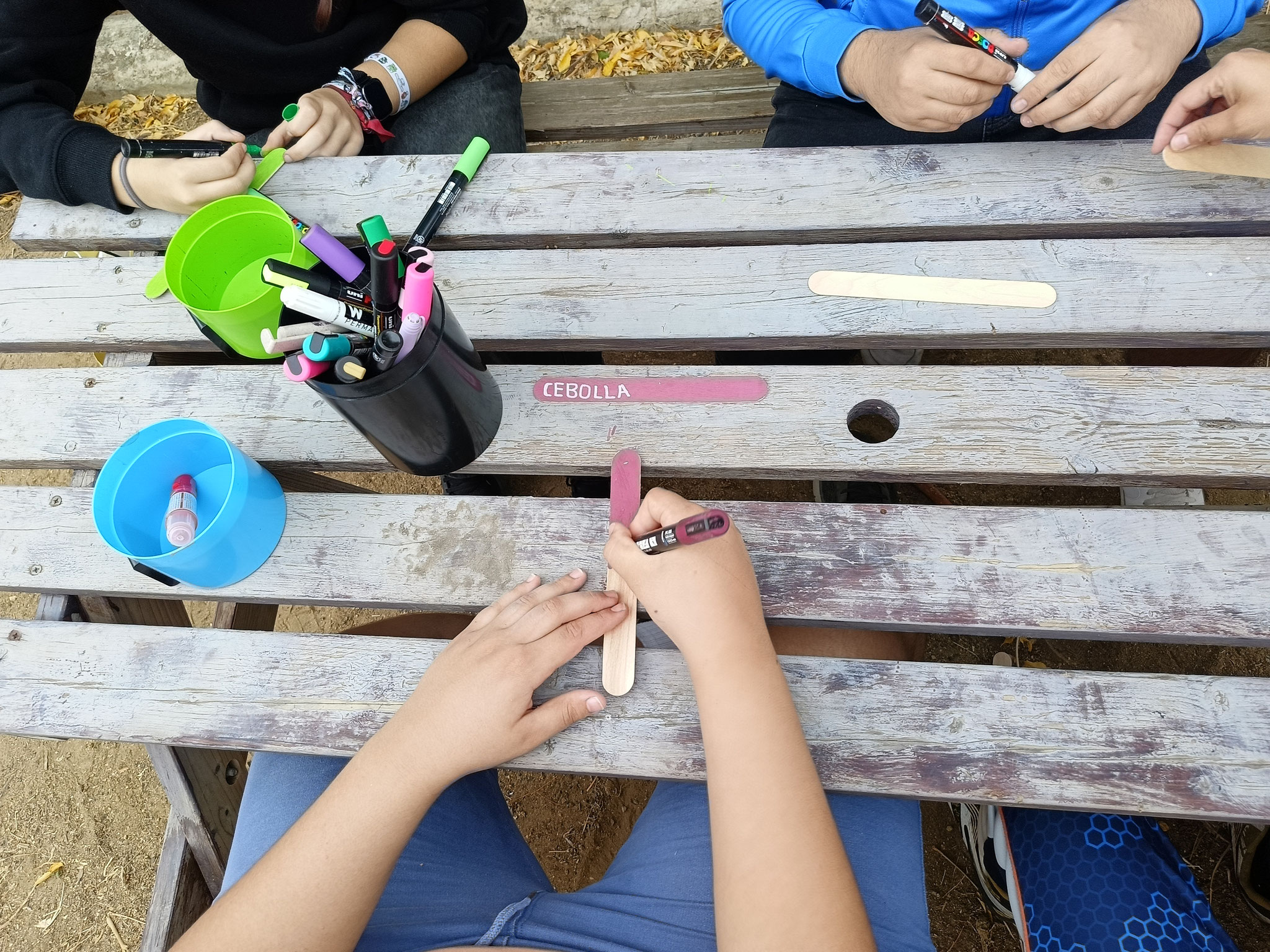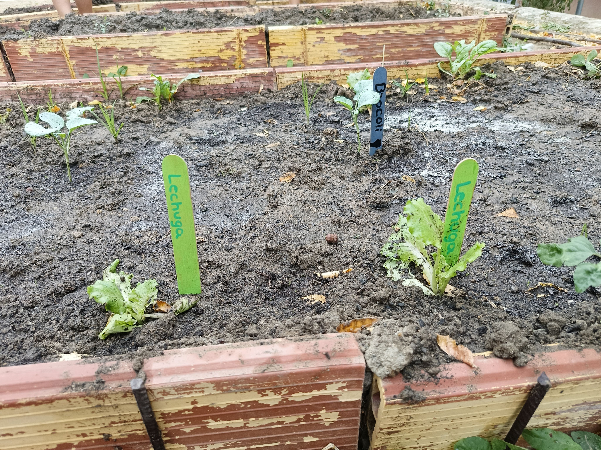 Además, para ir aprendiendo a reconocer las plantas desde «shiquititas» les hemos puesto cartelitos 🪧con el nombre y la fecha de trasplante.