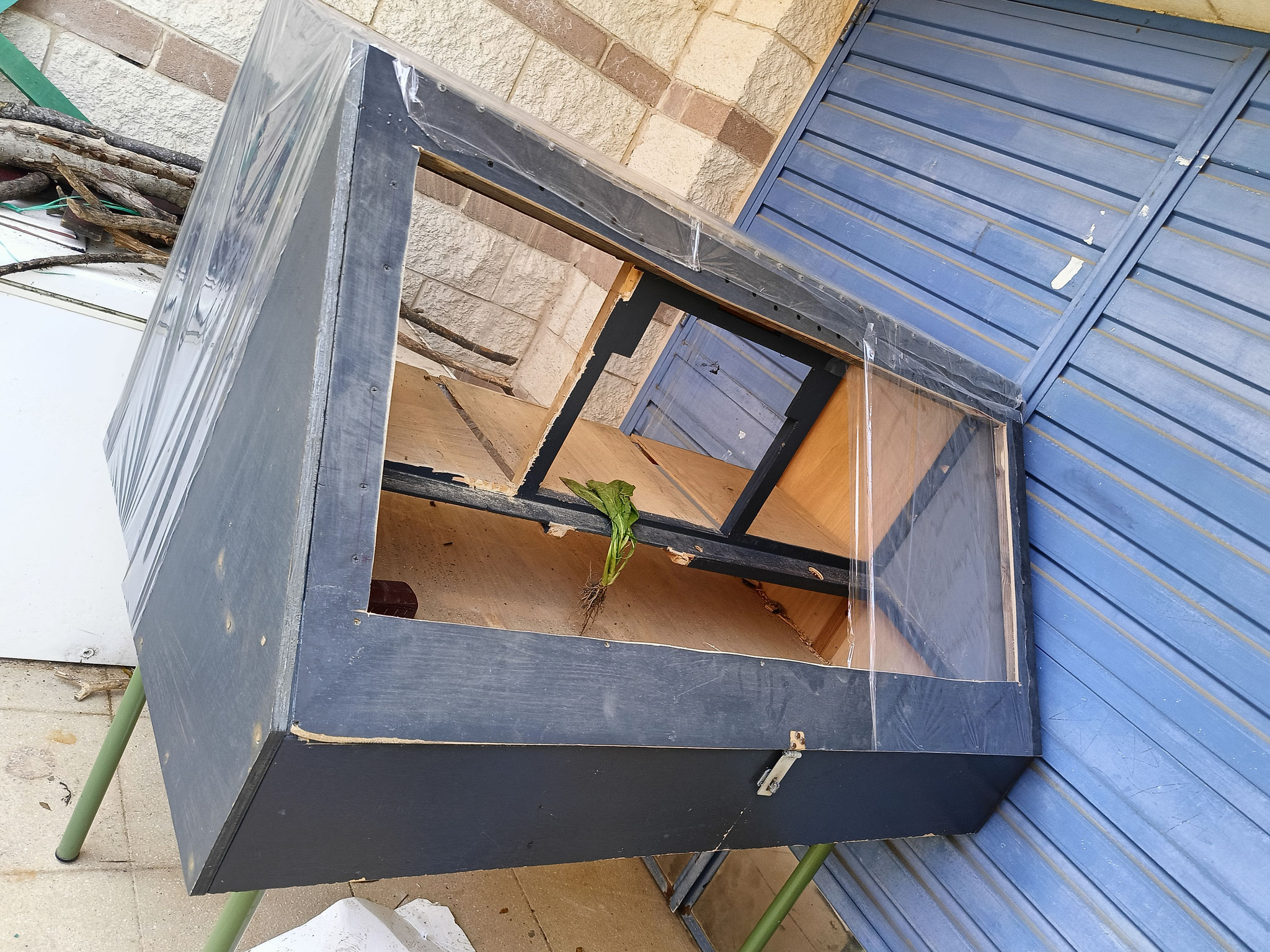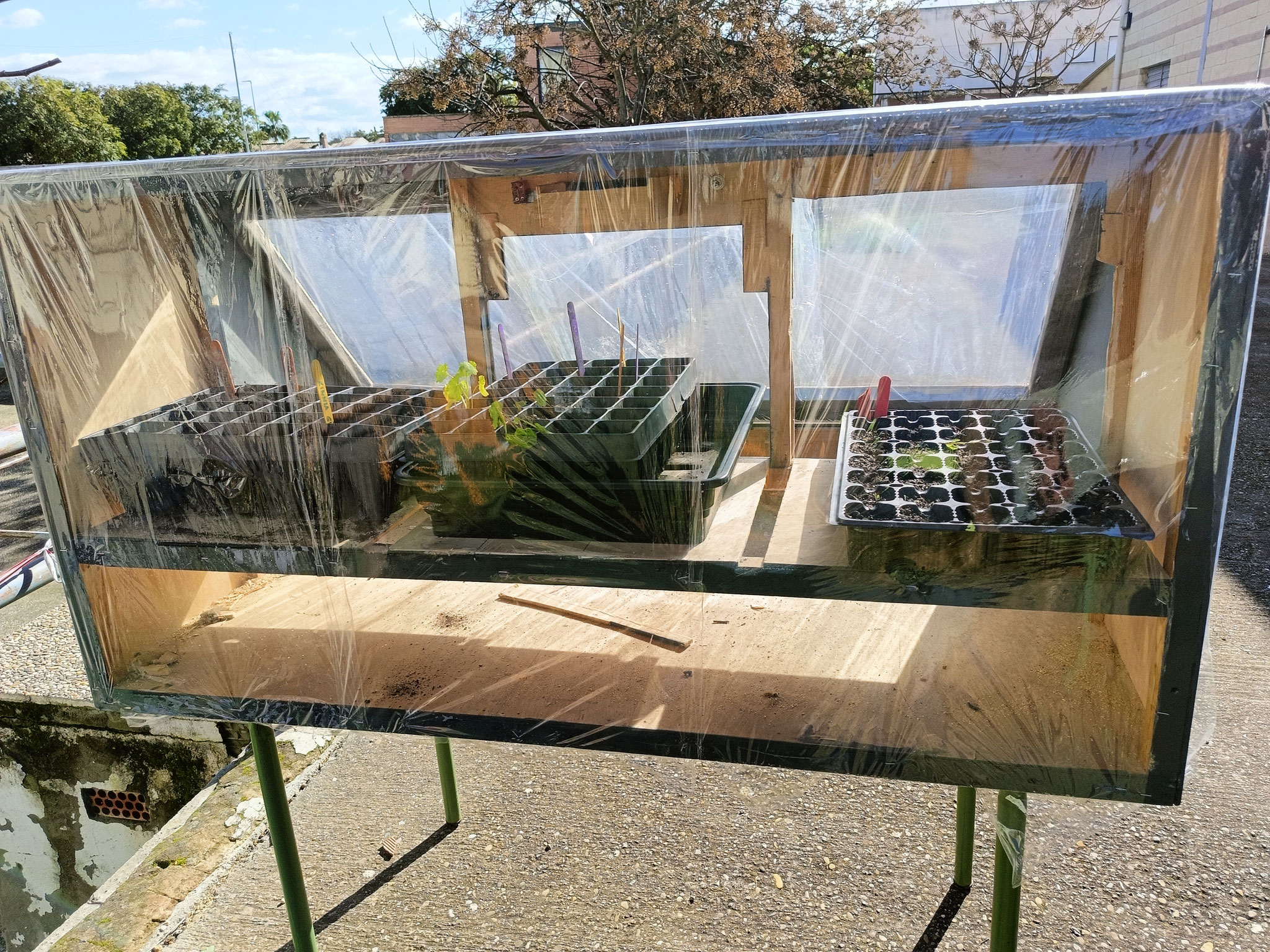 Como en invierno no podemos trabajar mucho en el huerto (porque ha hecho ❄❄y ⛈🌧) hemos aprovechado para reciclar un mueble y convertirlo en un mini invernadero, dónde se han colocado los semilleros para que estén calentitos y a cubierto del frío.